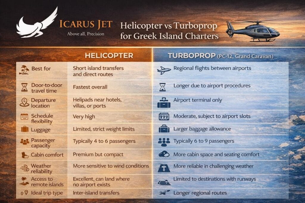So, which one is better? It all depends on your priorities. For a quick, seamless, and efficient trip, a helicopter is likely your best bet. For a reliable, spacious, and cost-effective option, a turboprop is a better choice. If you still have questions or are planning a flight within the Greek Isles, please contact our charter team today.