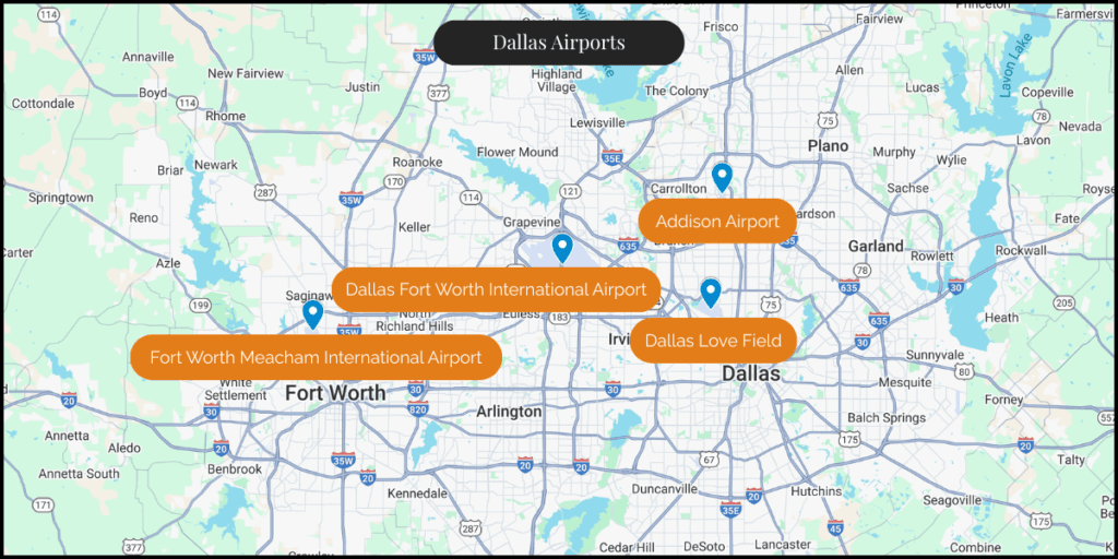 Dallas Love Field and Dallas Fort Worth International Airport are large commercial airports. Although both allow for private aviation access, airline traffic can sometimes cause runway delays and gate congestion.