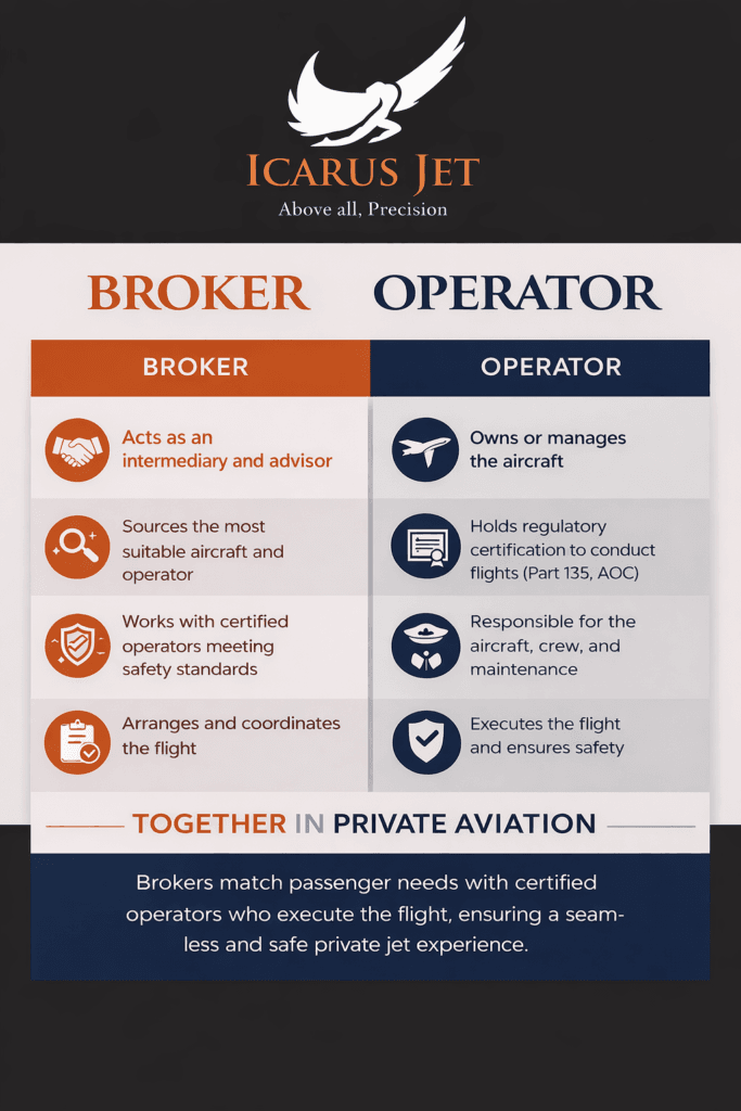 Brokers supply access, guidance, and coordination. Operators supply the aircraft, crew, and flight. Together, they control the entire passenger experience, from the initial request to the final landing.