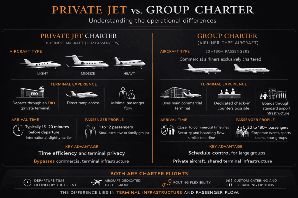 For large group charter flights on regional-type aircraft, passengers depart from the main commercial airport terminals. Although the charter is exclusive and passengers can determine the day, time, and destination of the flight, the departure process occurs through the main terminal.