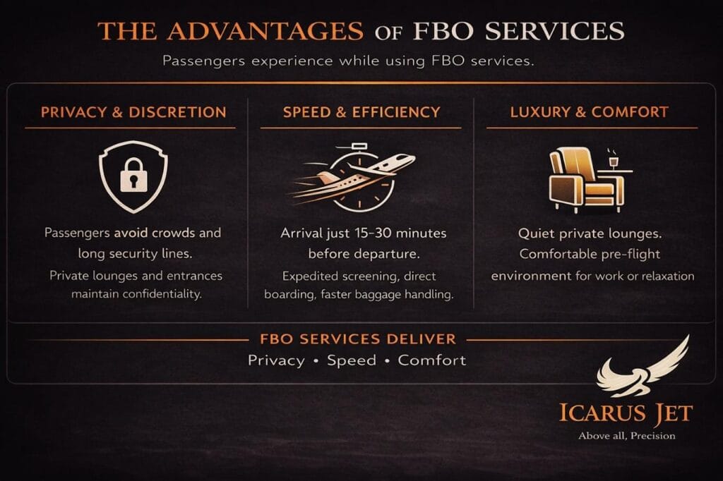 For smaller private jets, the FBO experience is the entire departure process. It replaces the check-in counters, security lines, and boarding gates associated with commercial travel.