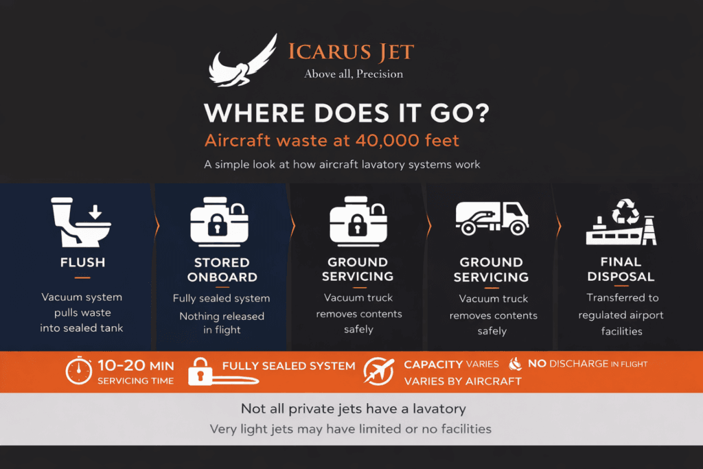 This article takes a closer look at waste management aboard private jets, what really happens when you press that flush button, and how it all gets handled once the flight ends.