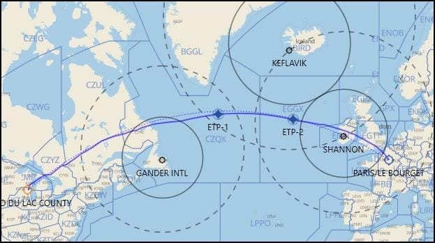 Image: ETOPS arcs for Atlantic crossings: CYQX (Gander), BIKF (Keflavik), EINN (Shannon).