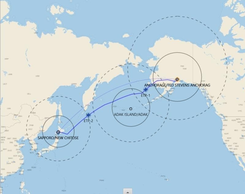 Image: Anchorage–Sapporo route via Adak Island, with ETOPS arcs showing diversion coverage.