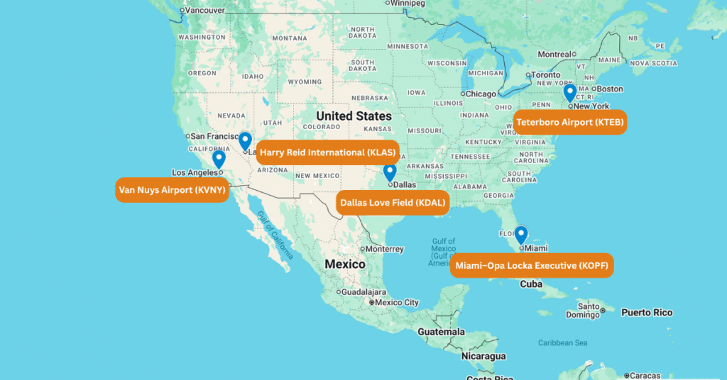 Below we evaluate the current operating environment that exists at five of the busiest general aviation airports in the U.S. These airports include Teterboro Airport (KTEB) in New Jersey; Van Nuys (KVNY) in California; Miami-Opa Locka Executive (KOPF); Dallas Love Field (KDAL), and Harry Reid International (KLAS), in Nevada. Each airport offers a distinct environment that varies according to geographical location.
