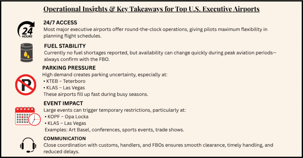Although most U.S. airports are standardized in terms of operating procedures, factors such as hangar and fuel availability, and customs operating hours can change quickly, particularly in heavy-volume business-aviation airports. As such, pilots and flight planners must be current with this information to ensure that flight planning proceeds efficiently.
