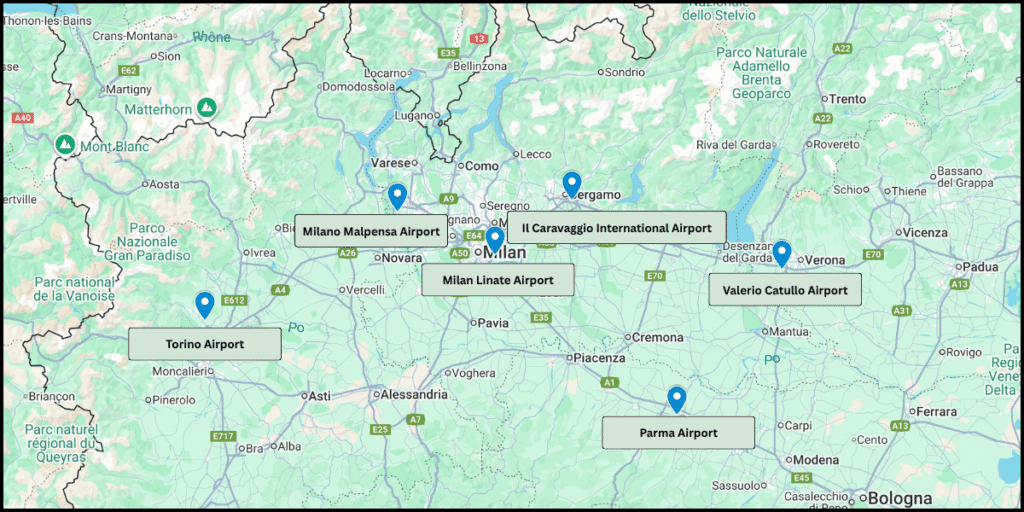 Milan Malpensa (LIMC) and Linate (LIML) would be the primary points of entry, with alternates of Bergamo (LIME), Verona (LIPX), Parma (LIMP).